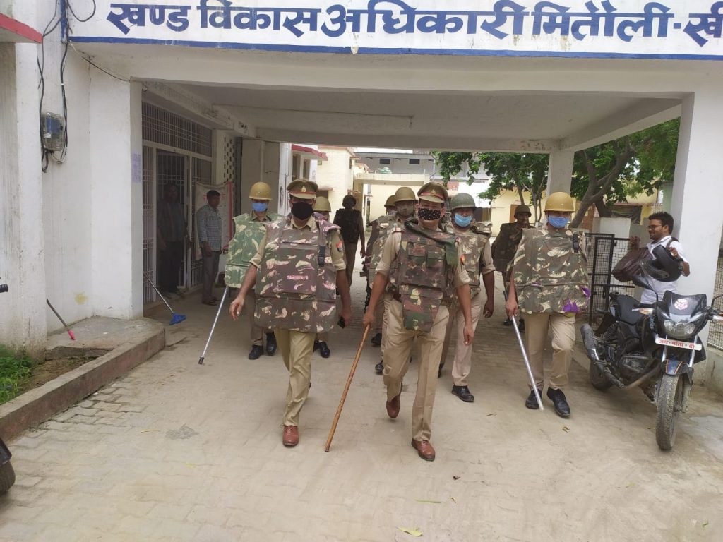 मितौली:विकासखंड मितौली मुख्यालय स्थित ब्लाक प्रमुख पद के नामांकन के अवसर पर पुलिस प्रमुख खीरी विजय ढुल के निर्देशन में शांति व्यवस्था बनाए रखने के उद्देश्य को लेकर चप्पे-चप्पे पर पुलिस के जवान तैनात रहे पुलिस उपाधीक्षक मितौली संदीप सिंह एवं उप जिलाधिकारी मितौली दिग्विजय सिंह द्वारा समय-समय पर स्थितियों पर नजर रखी गई पुलिस इंस्पेक्टर डीपी तिवारी द्वारा विकासखंड के गेट पर समुचित पुलिस बल की ड्यूटी लगाई गई थी वही स्वयं भी विकासखंड मुख्यालय पर प्रभारी थानाध्यक्ष उप निरीक्षक जेपी यादव वह पुलिस के जवानों के साथ मुस्तैदी के साथ शांति व्यवस्था बनाए रखने मैं पूर्ण भागीदारी निभाई गई/