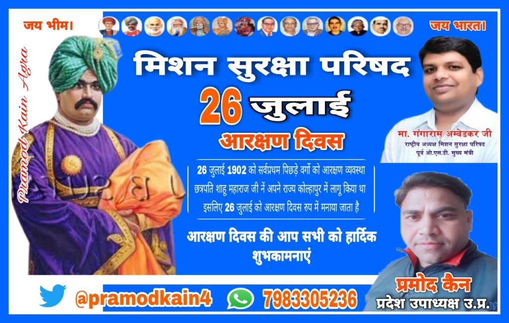 26 जुलाई 1902 में कोल्हापुर नरेश छत्रपति शाहूजी महाराज द्वारा पहली बार आधिकारिक शासनादेश के रूप में शुद्रो तथा अति शूद्रों सहित सभी गैर ब्राह्मणों के लिए 50 फ़ीसदी आरक्षण का ऐलान किया था।ज्योतिबा फुले के ‘आनुपातिक आरक्षण’ से प्रेरणा लेते हुए सामाजिक परिवर्तन के महानायक एवं आरक्षण के जनक छत्रपति शाहू जी महाराज ने कोल्हापुर नरेश रहते हुए 26 जुलाई 1902 को समाज के कमजोर एवं पिछड़े वर्ग को आरक्षण देने का आदेश किया था। इसी आरक्षण की वजह से वर्णवादी व्यवस्था से शोषित समाज के दबे , कुचले, पिछड़े बहुजन समाज को भागीदारी मिलने का सिलसिला शुरू हो सका।इसीलिए 26 जुलाई को आरक्षण दिवस मनाया जाता है।इस आरक्षण दिवस पर मिशन सुरक्षा परिषद परिवार की ओर से आप सभी को बहुत-बहुत मंगलकामनाएं।