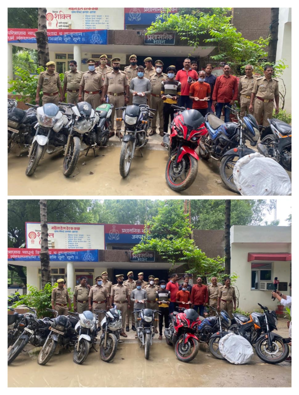 सैफई पुलिस ने वाहन चोर गिरोह का भंडाफोड़ करते हुऐ तीन वाहन चोरों को चोरी की गयी नौ मोटरसाइकिल व मोटरसाइकिल के पार्टस तथा दो अवैध तमंचा एक चाकू सहित किया गिरफ्तार