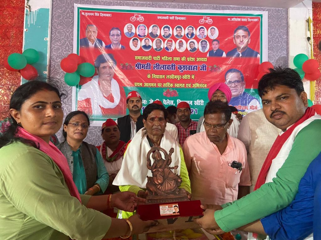 लखीमपुर:समाजवादी पार्टी में लीलावती कुशवाहा जी को प्रदेश अध्यक्ष महिलासभा बनाये जाने पर प्रथम जनपद -लखीमपुर-खीरी आगमन /निघासन कार्यक्रम पर अनीता यादव जी नि0 प्रदेश उपाध्यक्ष महिलसभा/पूर्व प्रत्याशी 137,पलिया विधानसभा और पूर्व जिलामहासचिव नरेश यादव जी ने स्मृति चिन्ह भेंट कर स्वागत किया।