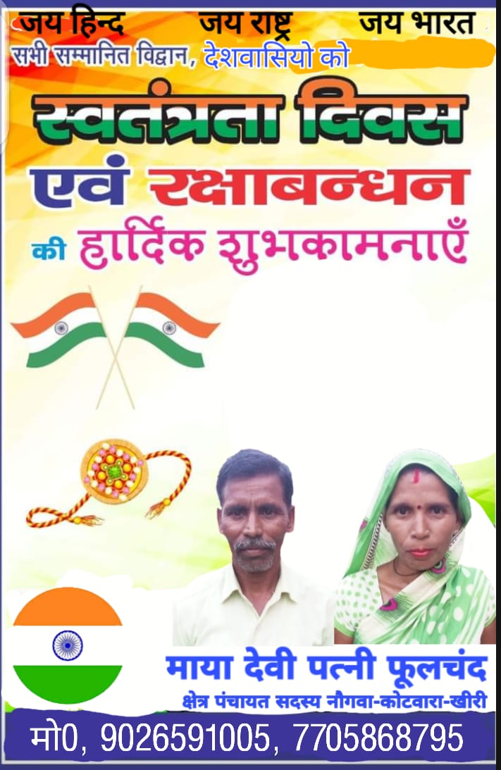 सभी आदरणीय देश प्रदेश जनपद व क्षेत्रवासियों को आजादी के शुभ अवसर पर ढेर सारी बधाइयां व शुभकामनाएं 15 अगस्त 1947 को हमारा देश आजाद हुआ था जिसे आजाद करने के लिए ना जाने कितने स्वतंत्रता सेनानियों ने अपनी जान गवाई थी आज का दिन उन सभी शहीदों को याद करने का है उनके इस कार्य को हम कभी नहीं चुका पाएंगे लेकिन इतना जरूर है कि उनके द्वारा दिलाई गई इस आजादी को संभाल कर रखेंगे 15 अगस्त 1947 को हमारा देश स्वतंत्र हुआ था इस आजादी की लड़ाई को भूले नहीं भुलाया जा सकता उनके जुल्मों को उनके द्वारा मिली प्रेरणा को कभी नहीं भूल सकते हमें और अपने भारत को इतना मजबूत करना है कि कोई हम पर कब्जा करने की तो दूर की बात हमारे भारत की तरफ आंख उठाकर भी ना देख सके ।हमारे भारत के लिए जिन हस्तियों ने अपनी अपनी जान की कुर्बानी दी है ।और मैं अपने भारत के लिए अगर जान देनी पड़ेगी तो मैं पीछे नहीं हटूंगा साथियों भारत किसी देश से कम नहीं है भारत के पास सब कुछ है जो अन्य देशों के पास नहीं है भारत को किसी के आज आगे हाथ फैलाने की जरूरत नहीं साथियों आज हम स्वतंत्र हैं आज हम को पूर्ण आजादी मिली है।