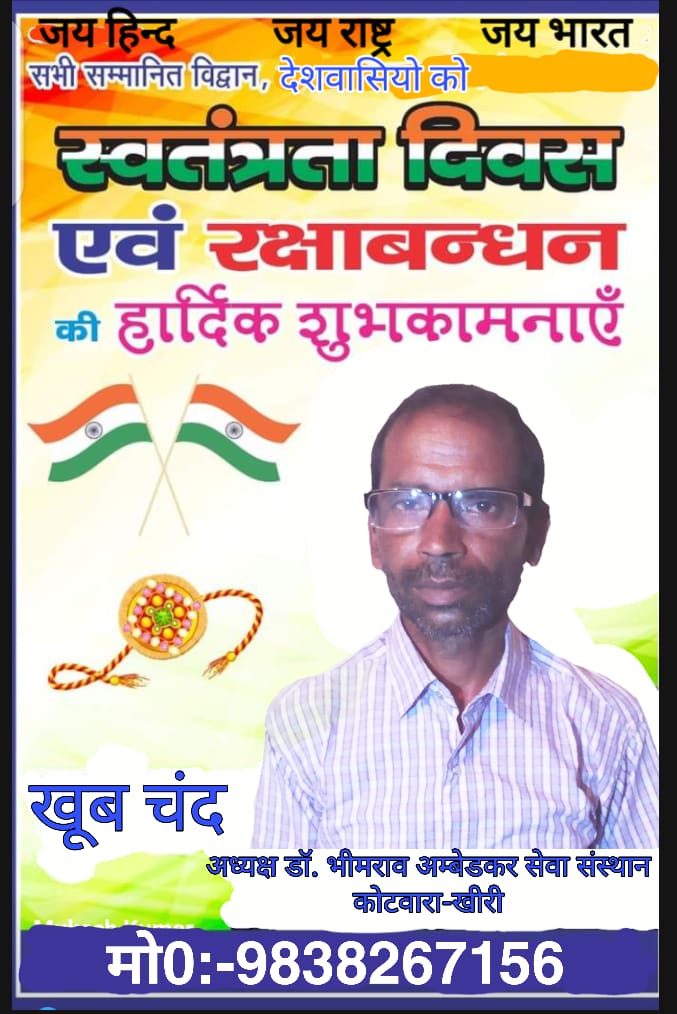 खूब चंद अध्यक्ष डॉ.भीमराव अम्बेडकर सेवा संस्थान कोटवारा 15 अगस्त ढेर सारी बधाइयां व शुभकामनाएं
