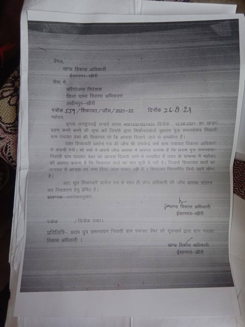 लखीमपुर: विकासखंड ईसानगर की ग्राम सभा डेबर का है जहां एक आवास के सिलसिले में ग्राम विकास अधिकारी राघवेंद्र प्रताप वर्मा ने एक जांच पर आख्या लगाई थी उस आंख्या में लिखा था की लाभार्थी का नाम सूची में नहीं है जबकि लाभार्थी को पहली किस्त प्राप्त हो चुकी थी जानकारी लेने पर ग्राम विकास अधिकारी बता रहे हैं कि अगर किसी लाभार्थी को पहली किस्त प्राप्त हो जाती है तो उसका नाम सूची से नहीं कटता जबकि महोदय ने ही एक जांच की आख्या में यह दर्शाया है की लाभार्थी का नाम सूची में नहीं है अब क्या सच माना जाए महोदय की आख्या या महोदय के वचन।