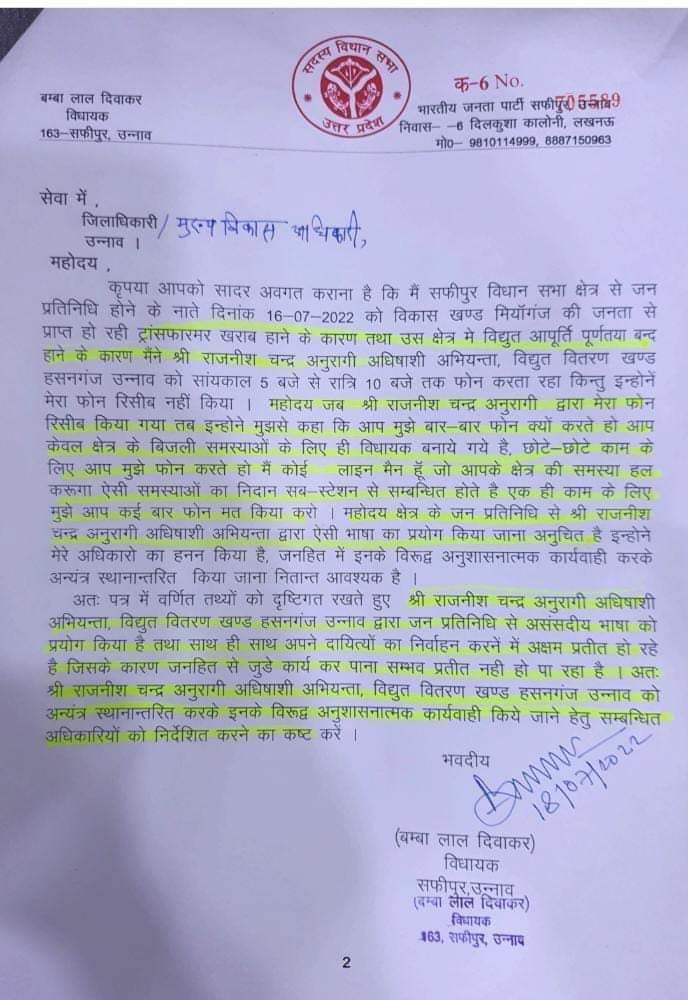 लखनऊ:राज्य मंत्री दिनेश खटीक के इस्तीफे के बाद एक और विधायक का पत्र वायरल। जनपद उन्नाव के सफीपुर विधानसभा के भाजपा विधायक बंबा लाल दिवाकर का बड़ा आरोप। विधायक ने अधिशासी अभियंता अवनीश चंद्र अनुरागी पर लगाया असंसदीय भाषा के प्रयोग का आरोप। विधायक ने अपमानित करने का भी लगाया आरोप। भाजपा के दलित विधायक और मंत्री जब अपना सम्मान नहीं बचा पा रहे हैं तो समाज का सम्मान कैसे सुरक्षित रखेंगे।