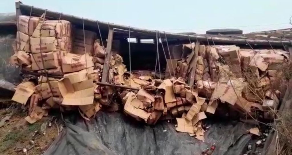 देशी शराब से भरा 10 टायरा ट्रक पलटा।ग्रामीणों की भीड़ शराब की पेटी लूटकर हुई फरार