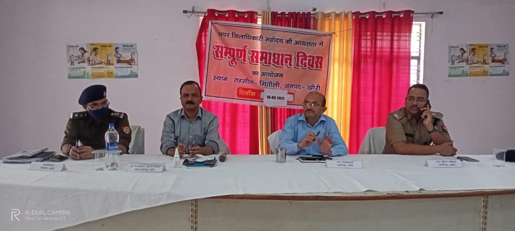 विकास खंड सभागार मितौली में संपूर्ण समाधान दिवस अपर जिला अधिकारी लखीमपुर की अध्यक्षता व अपर पुलिस अधीक्षक लखीमपुर , उपजिलाधिकारी मितौली दिग्विजय सिंह, क्षेत्राधिकारी मितौली सीतांशु कुमार की मौजूदगी में संपन्न हुआ जिसमें तहसील क्षेत्र के समस्त अधिकारी कर्मचारी मौजूद रहे।