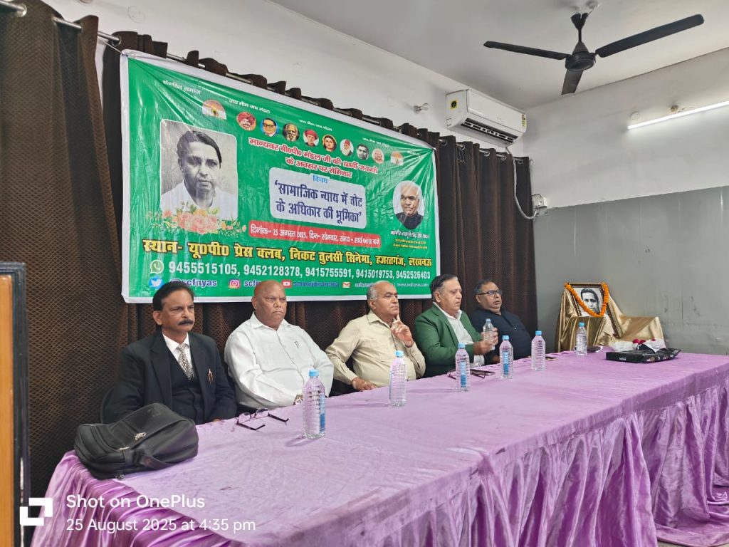 लखनऊ : 25 अगस्त 2025 दिन सोमवार को सामाजिक चेतना फाउण्डेशन न्यास द्वारा मान्यवर बीपी मंडल जयंती जी की जयंती के अवसर पर उत्तर प्रदेश प्रेस क्लब लखनऊ में सामाजिक चेतना फाउण्डेशन न्यास द्वारा “सामाजिक न्याय में वोट के अधिकार की भूमिका” विषय पर एक सेमिनार का आयोजन किया गया।सेमिनार में सामाजिक चेतना फाउण्डेशन न्यास के संस्थापक इलाहाबाद उच्च न्यायालय के अवकाश प्राप्त न्यायाधीश माननीय न्यायमूर्ति वीरेंद्र सिंह जी, न्यास के अध्यक्ष पूर्व जनपद न्यायाधीश बी डी नकवी जी, उपाध्यक्ष प्रोफेसर राजेंद्र वर्मा जी, उपाध्यक्ष एडवोकेट देवेंद्र सिंह जी, सचिव महेंद्र कुमार मंडल जी के साथ न्यास के समस्त पदाधिकारी और सदस्य गण उपस्थित रहे।न्यास में मुख्य रूप से लखनऊ विश्वविद्यालय के प्रोफेसर मुनेश कुमार, उच्च न्यायालय लखनऊ के वरिष्ठ अधिवक्ता आईपी सिंह जी, अधिवक्ता राजेश श्रीवास्तव जी, अधिवक्ता रामबाबू सहित बड़ी संख्या में लोगों ने सेमिनार में प्रतिभाग किया। सेमिनार में अपने विचार रखते हुए पूर्व न्यायमूर्ति वीरेंद्र सिंह जी ने कहा की सामाजिक न्याय की संकल्पना धरातल पर तब तक मूर्त रूप नहीं लेगी जब तक मंडल कमीशन की सभी अनुशंसाओं को सरकार द्वारा लागू नहीं किया जाएगा, उन्होंने बताया कि वर्तमान में मंडल कमीशन की सिर्फ दो ही अनुशंसाएं लागू हैं शेष 38 अनुसंधानों को बगैर लागू किया सामाजिक न्याय की संकल्पना एक दिवास्वप्न की तरह है, सेमिनार में बोलते हुए पूर्व जनपद न्यायाधीश बी डी नकवी जी ने समाज में व्याप्त ऊंच नीच छुआछूत और भेदभाव को सामाजिक न्याय के मार्ग में सबसे बड़ा रोड़ा बताया उन्होंने कहा कि जब तक समाज जात-पात छुआछूत और धर्म के आधार पर विभाजित रहेगा तब तक इस देश के पिछड़े वंचित और शोषित समाज का कल्याण संभव नहीं है, उन्होंने मान्यवर बीपी मंडल को नमन करते हुए कहा कि जिस प्रकार से मंडल जी ने देश भर में घूम-घूम कर आंकड़े जुटाए और ओबीसी वर्ग के हितों की रिपोर्ट तैयार की उस रिपोर्ट की जब तक सभी अनुशंसाएं लागू नहीं की जाती हैं पिछड़े वर्ग का भला नहीं होने वाला है।