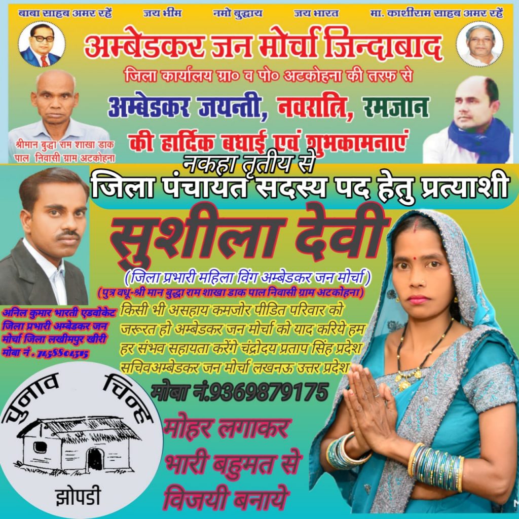 अम्बेडकर जन मोर्चा द्वारा समर्थित जिला पंचायत सदस्य प्रत्यासी सुशीला भारती के लिए जनता से वोट की अपील जिला प्रभारी महिला विंग अम्बेडकर जन मोर्चा पत्नी अनिल कुमार भारती एडवोकेट जिला प्रभारी का चुनाव निशान झोपड़ी पर मोहर लगाकर भारी बहुमत से विजयी बनाये धन्यवाद।